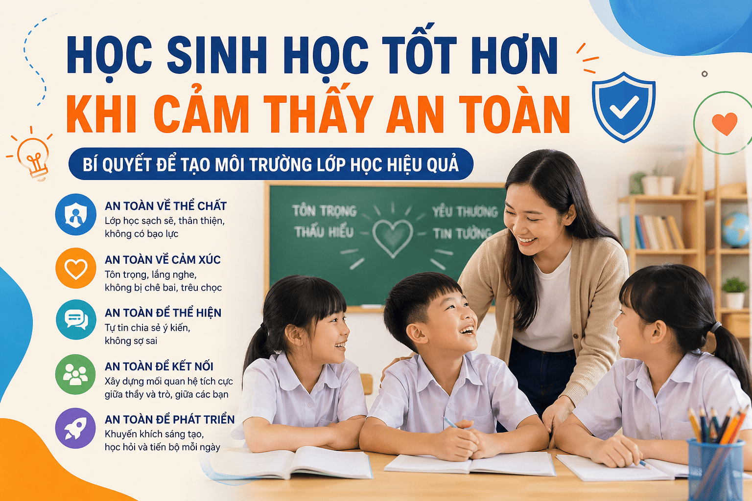 Khi học sinh cảm thấy an toàn, các em trở nên gắn bó, tin tưởng vào thầy cô và bạn bè. Sự thân thiện, hòa nhập này tạo động lực mạnh mẽ để khám phá kiến thức mới, mạnh dạn phát biểu cũng như đóng góp sáng tạo vào các dự án.